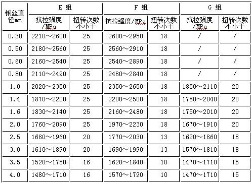 該標(biāo)準(zhǔn)規(guī)定鋼絲分甲、乙、丙3組供貨。丙組適應(yīng)于較高應(yīng)力彈簧,乙組適應(yīng)于高應(yīng)力彈簧,甲組適用于超高應(yīng)力彈簧。標(biāo)準(zhǔn)推薦鋼絲采用T9A,T10A和T8MnA制造。實(shí)際上鋼絲抗拉強(qiáng)度隨碳含量增高而上升,扭轉(zhuǎn)性能(韌性指標(biāo))隨碳含量上升而下降,綜合考慮,遼寧特殊鋼集團(tuán)大連三大鋼絲公司選用加稀土的T9A鋼絲生產(chǎn)甲、乙、丙組鋼絲。成品鋼絲考核抗拉強(qiáng)度、扭轉(zhuǎn)、扭轉(zhuǎn)斷口、纏繞、抗拉強(qiáng)度均勻性和尺寸均勻性六項(xiàng)性能指標(biāo),常見規(guī)格的力學(xué)性能如表6。